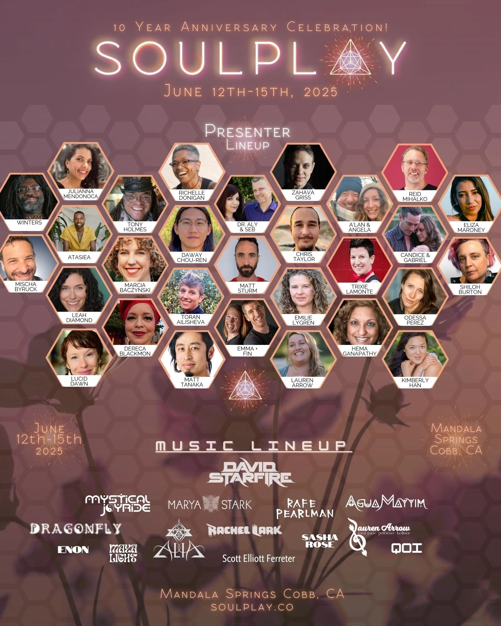 SoulPlay celebrates 10 years — their milestone anniversary! A heart-opening and playful growth experience in an intimate, substance-free setting. Come Play with a Purpose: to Dare, Dance and Thrive! Let's connect deeply on Thursday - As You Are, and Friday night at Pleasure Alchemy with my dear friends Tony Holmes and shiloh burton.